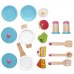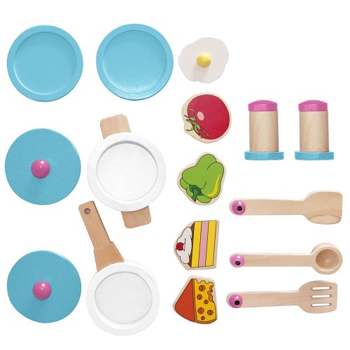 - Дървената кухня съдържа прозрачна отваряема фурна, тя разполага с разнообразни съдове за готвене, аксесоари и дори зеленчуци.
