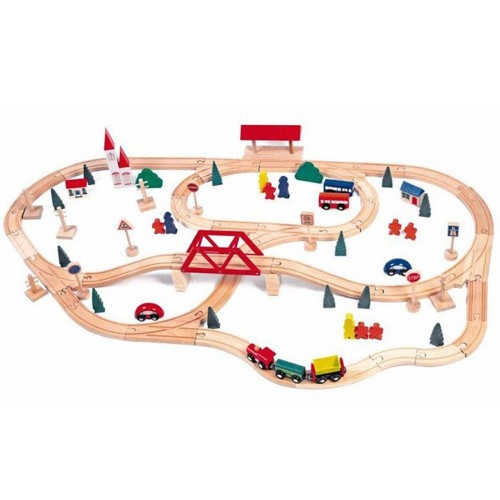Комплект дървено влакче с релси и аксесоари (общо 90 части), с което могат да се сглобят различни влакови трасета, около тях да се разполагат сгради, дървета, да се придвижват малките дървени автомобилчета и автобуси, както и двете фигурки на човечета.Характеристики: