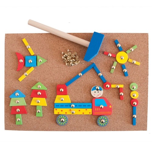 - Комплектът съдържа: 1 коркова дъска, 2 чукчета, 100 пирончета, 126 дървени форми и шаблони