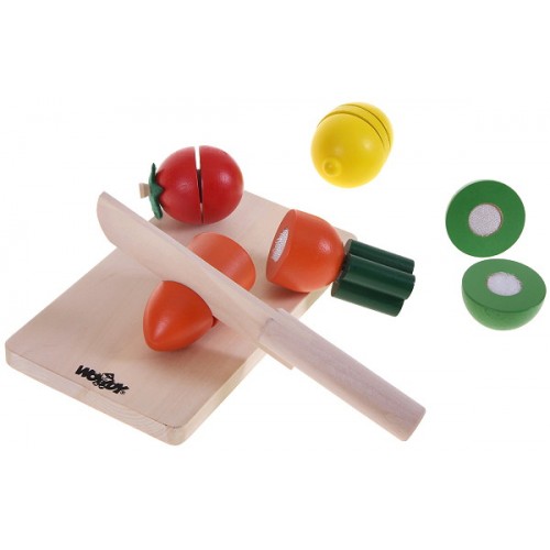 Детската дървена играчка "Дъска за рязане с плодове и зеленчуци" на Woody е интересна занимателна игра, с която детето се учи на точност и развива своето въображение.