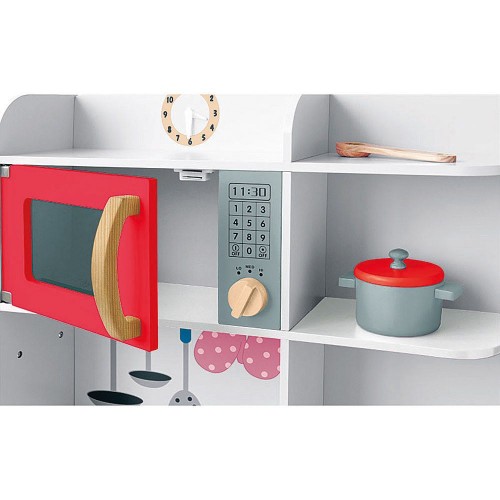 Кухня с атрактивен дизайн, отварящи се врати - микровълнова печка и фурна с въртящи се копчета, мивка, котлони, прибори за готвене, тенджера, тиган, часовник. Едната странична стена на кухнята има фолио с ефект "черна дъска" и място за поставяне на тебешири.Характеристики: