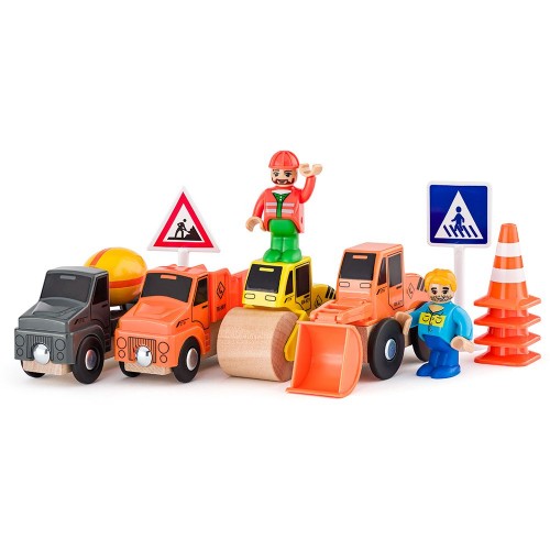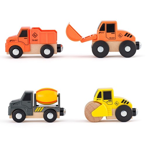 4 превозни средства: бетоновоз с красиви цветове, багер с преден товарач, валяк и самосвал. Всички те могат да се свържат с магнит един за друг.Характеристики: