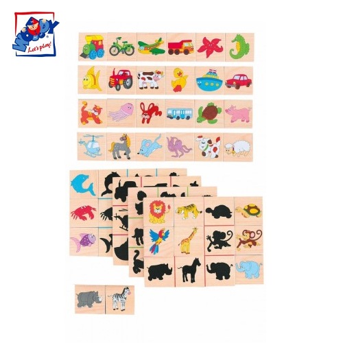 Една забавна и много полезна за малките деца игра. Комплектът съдържа 4 панела със сенките на животните от фермата, африканските животни, морските животни и превозни средства, 36 дървени квадратни плочки със съответните цветни фигури.Характеристики: